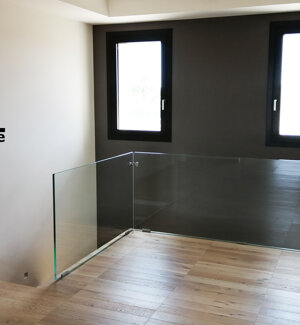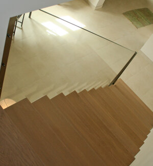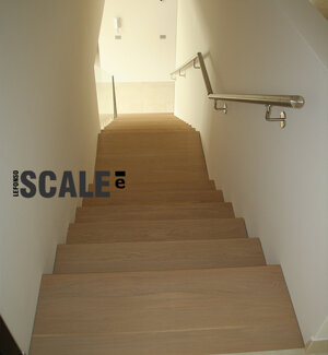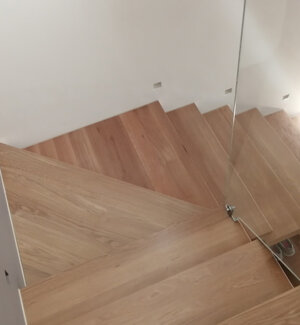 gradini in legno di rovere naturale , parapetto in cristallo di sicurezza esxtrachiaro assestante , rivestimento di scala in muratura esistente .