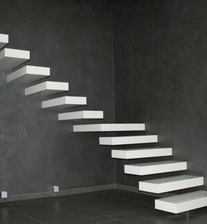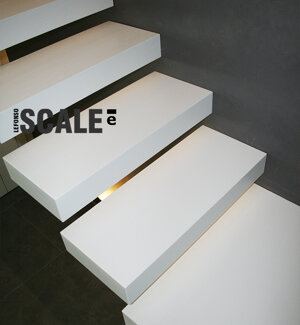 scala a sbalzo con gradini in legno di rovere spazzolato bianco.